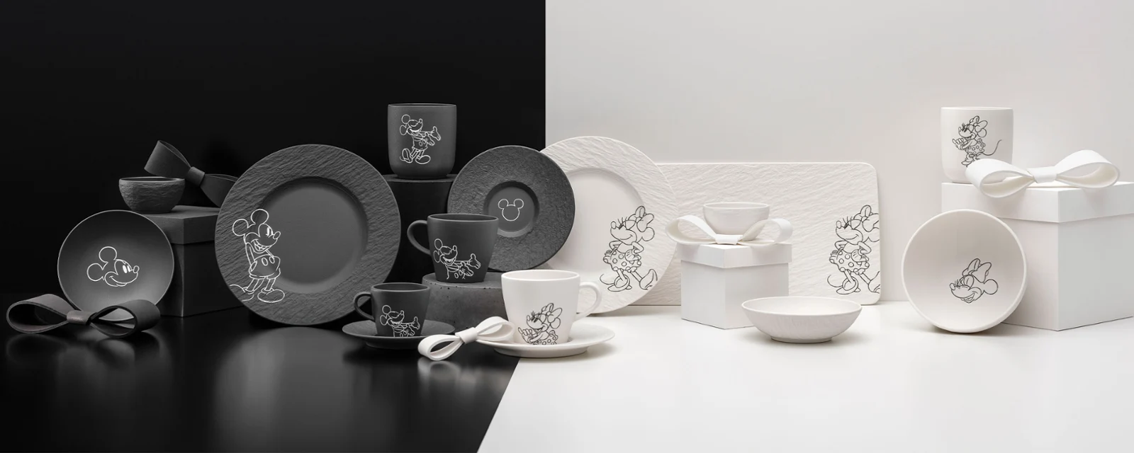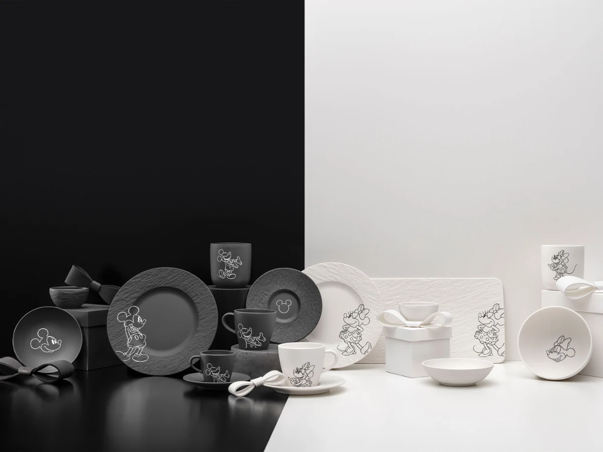 Colección completa Manufacture Mickey: vajilla de cerámica en diferentes tonos de blanco y negro sobre fondo blanco y negro.